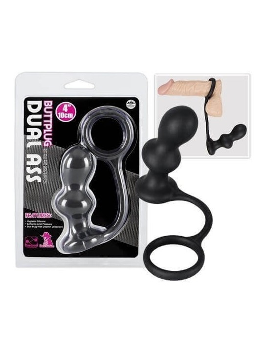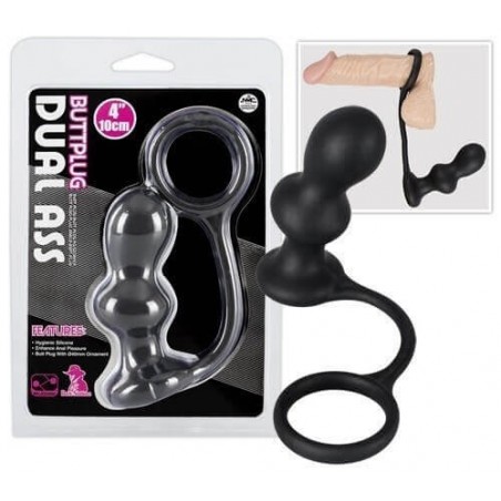 Plug anale Dual Ass combinato con anello per il pene! Ideato per la contemporanea doppia penetrazione. Composto da due sfere.
