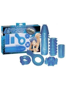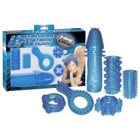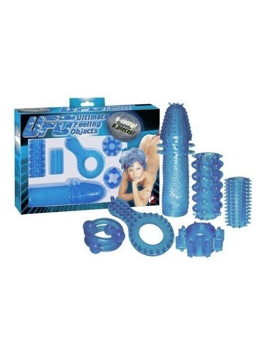 Set da 6 pezzi: diversi anelli per pene e manicotti blu. Materiale: TPE.