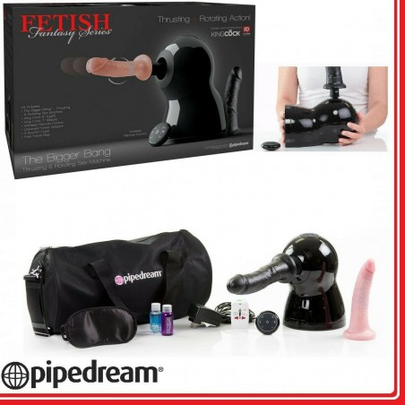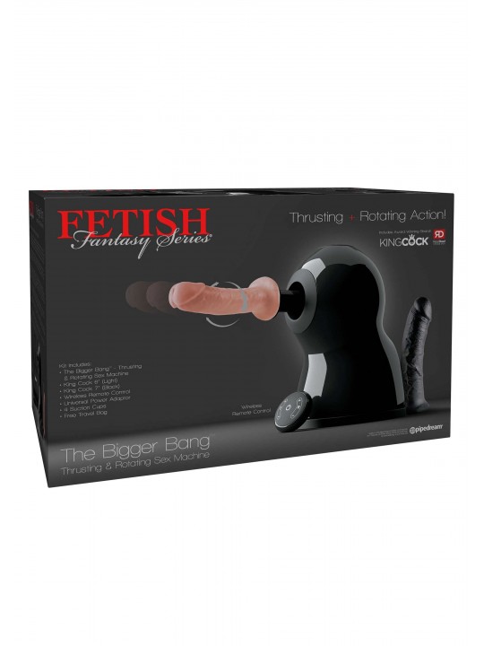 Il kit include: The Bigger Bang & Thrusting rotante Sex Machine, Dildo realistici King Cock 6 e 8 Pollici, Wireless Remote Control, Adattatore Universale, Borsa Bag Free Travel, mascherina in raso, campioni gratuiti di Moist Lotion & Toy Cleaner.
