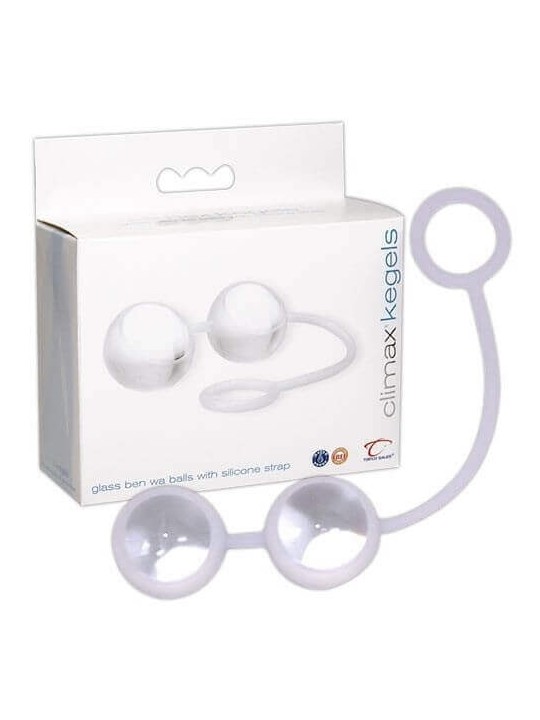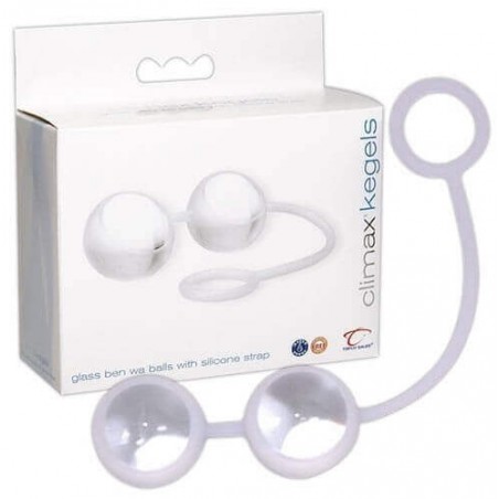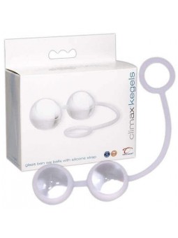 Coppia di sfere del piacere di vetro trasparente Climax Kegels! Garantiscono un'ottima stimolazione e se usate con costanza allenano i muscoli della vagina. Dotate di anello per gestire facilmente l'inserimento e l'estrazione.