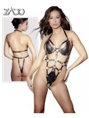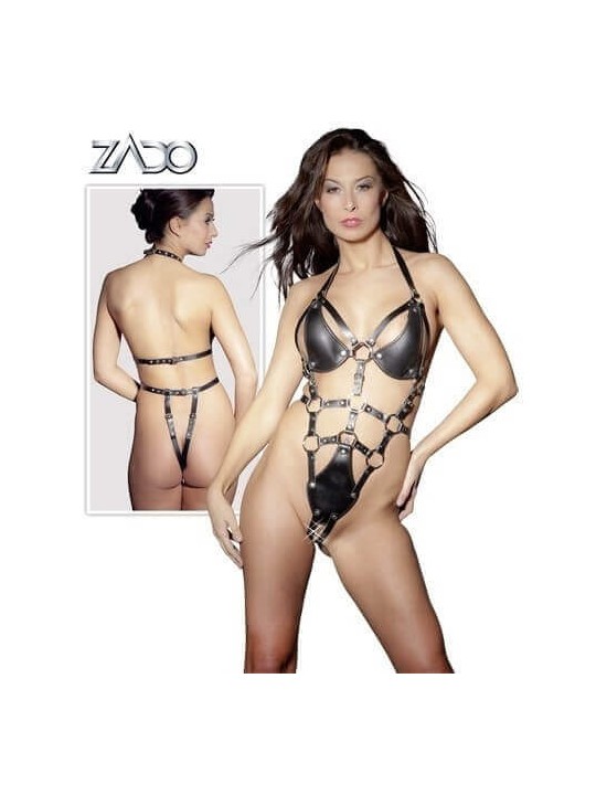 Trasgressivo body per donna con cinghie di pelle, anelli e coppe per seno rimovibili! Con inguine aperto. Tutto regolabile tramite fibbia per una perfetta vestibilità.