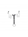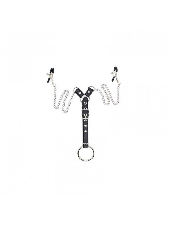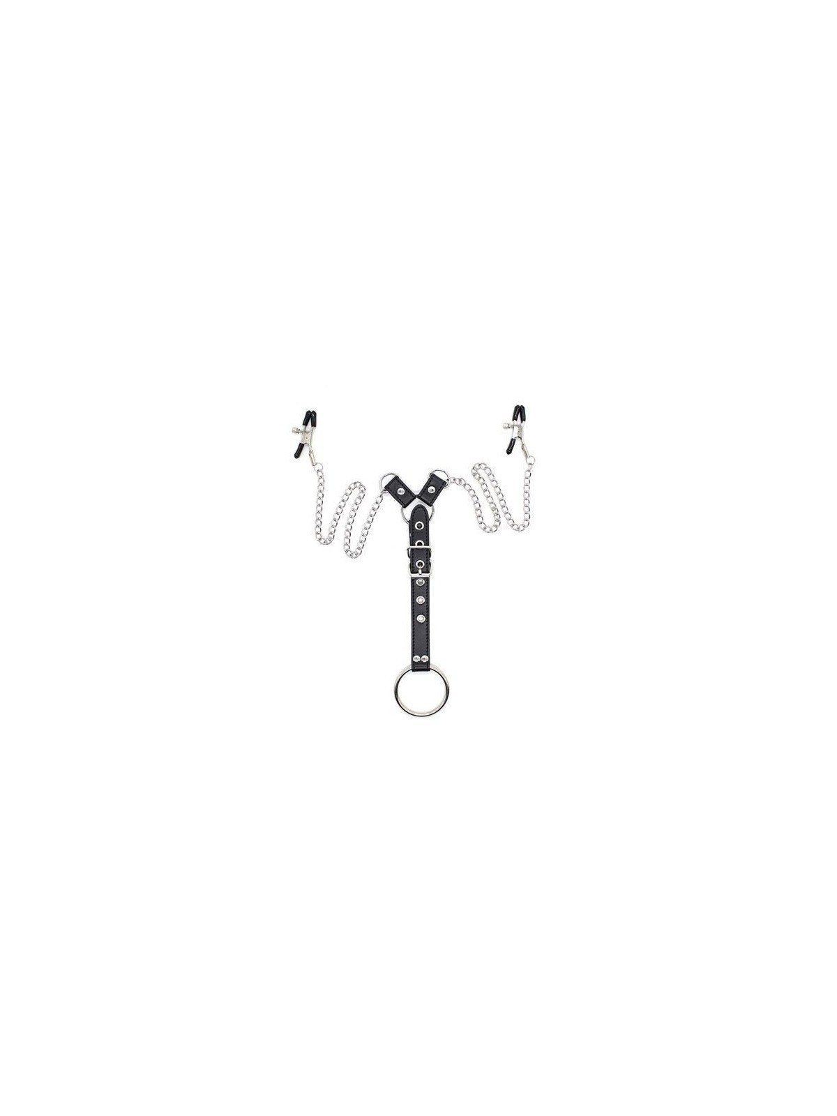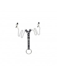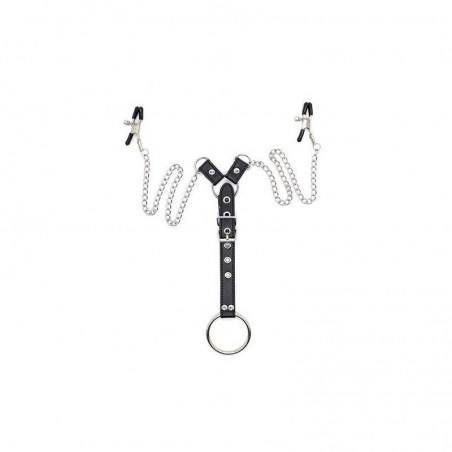 Due capezzolo morsetti su una catena, con allegati 3 anelli del pene intercambiabili su un moschettone.