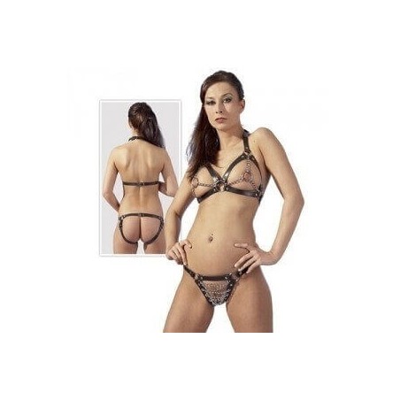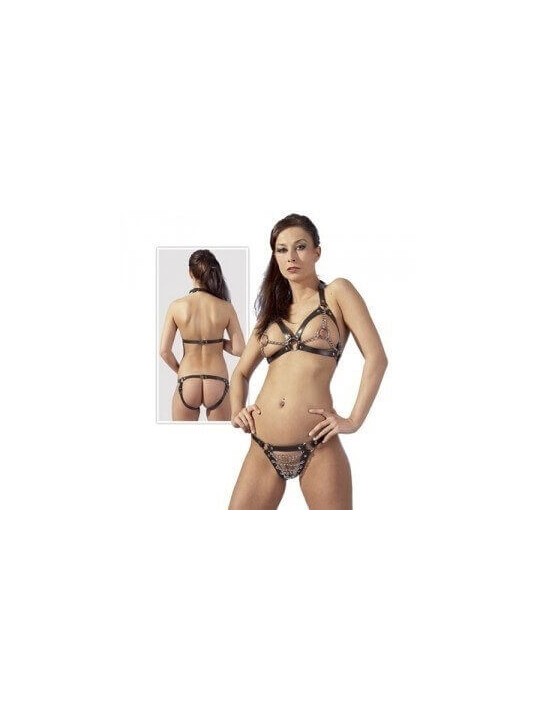 Bikini in pelle con cinghie di cuoio e catene di metallo. Regolabile nella parte posteriore di entrambi i pezzi grazie ad una fibbia.