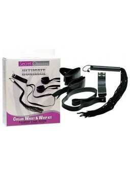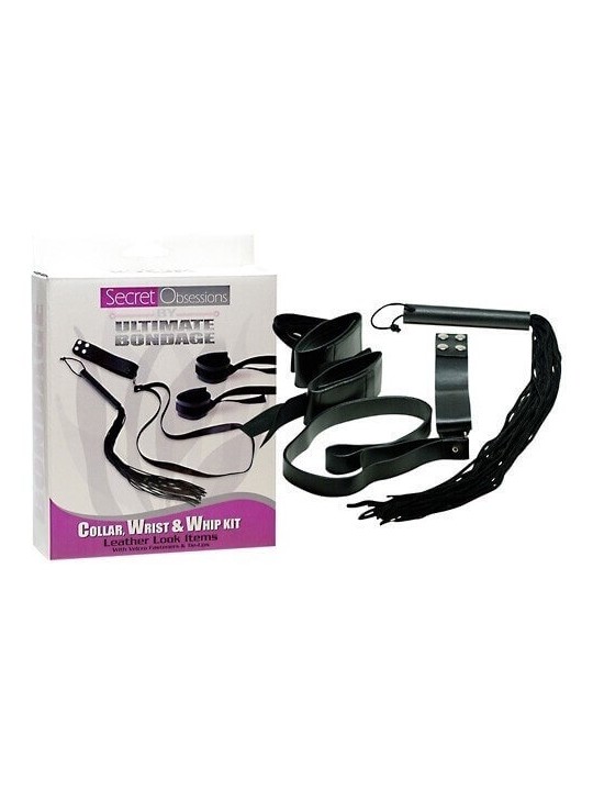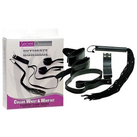Kit Ultimate-Bondage per chi vuole sperimentare trasgressivi giochi di sottomissione! Composta da 4 pezzi: frusta, collare, guinzaglio con moschettore e costrittivi per i polsi.