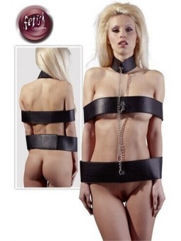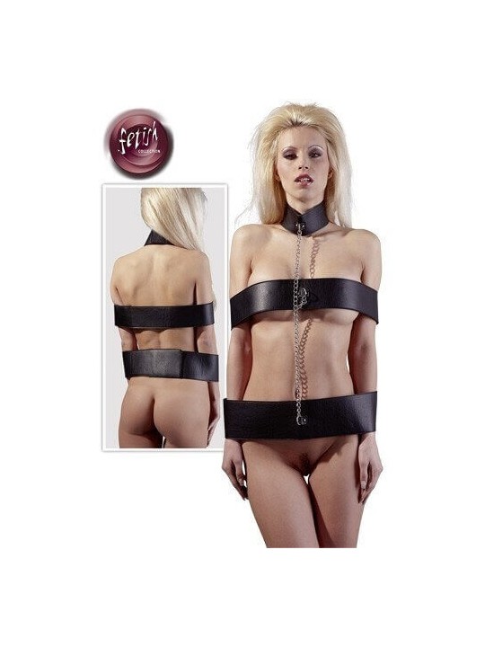 Costrittivo che blocca completamente il corpo del vostro partner! Ideale per giochi di dura sottomissione! Composto da due fascie in velcro che bloccano le braccia al busto, collegate tramite una catenina ad un collare!
