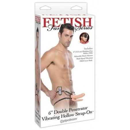 Strap-on color carne regolabile con due falli di color pelle, uno per penetrazione vaginale l'altro per penetrazione anale. Il fallo più grande può essere utilizzato come vibratore.